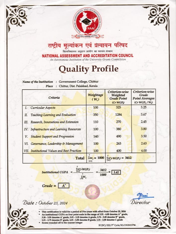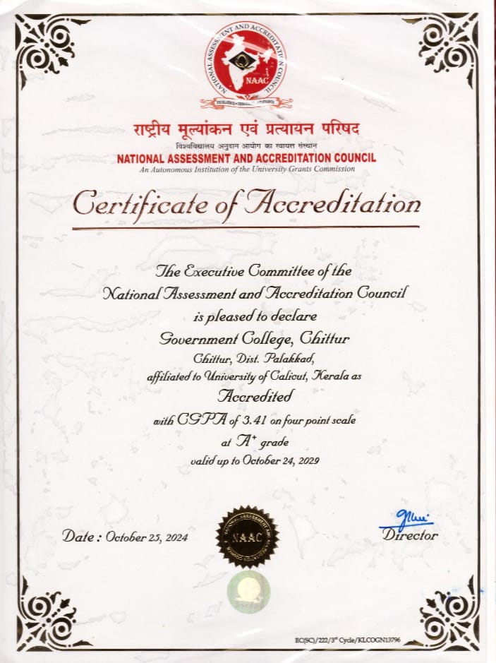 Welcome to Chittur College, a premier institution established on August 11, 1947. Initially a small government college in Cochin State, it has grown into one of Kerala’s finest Arts and Science colleges, offering a wide range of undergraduate, postgraduate and research programs. Our scenic campus on the Shokanashini River features state-of-the-art facilities, including modern academic blocks, well-furnished hostels, a swimming pool, and robust internet connectivity. Accredited by NAAC with A+ Grade in 2024, Chittur College continues to excel in providing quality education and fostering a vibrant research environment. We pride ourselves on our strong community spirit and dedication to student success, providing a nurturing environment for academic and personal growth. Join us at Chittur College – where tradition meets innovation, and every student’s potential is realized. Explore our diverse academic offerings, participate in our dynamic campus life, and become part of a legacy of excellence and achievement.