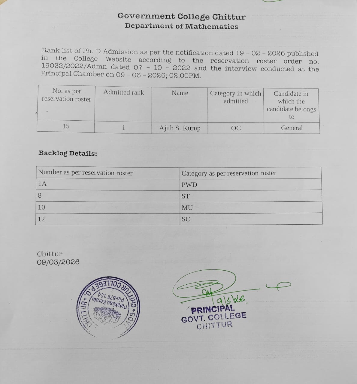 Rank List-Ph.D Admission in MATHEMATICS dt 09/03/2026 under the Research Guide Dr. G.N.Prasanth