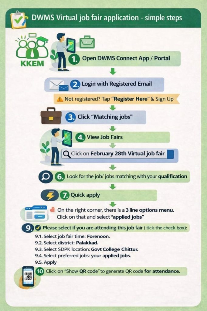 ഉദ്യോഗാർത്ഥികൾ DWMS Connect ആപ്പ് വഴി (Playstore -ൽ ലഭ്യമാണ്) മുൻകൂർ അപേക്ഷ സമർപ്പിച്ച് രജിസ്റ്റർ ചെയ്യേണ്ടതാണ്. രജിസ്ട്രേഷൻ നടത്തിയ ഉദ്യോഗാർത്ഥികൾ, അപേക്ഷ സമർപ്പിച്ച അതേ മൊബൈൽ ഫോണുമായി ജോബ് ഫെയർ നടക്കുന്ന ചിറ്റൂർ ഗവൺമെന്റ് കോളേജിൽ എത്തിച്ചേരണമെന്ന് അറിയിക്കുന്നു
